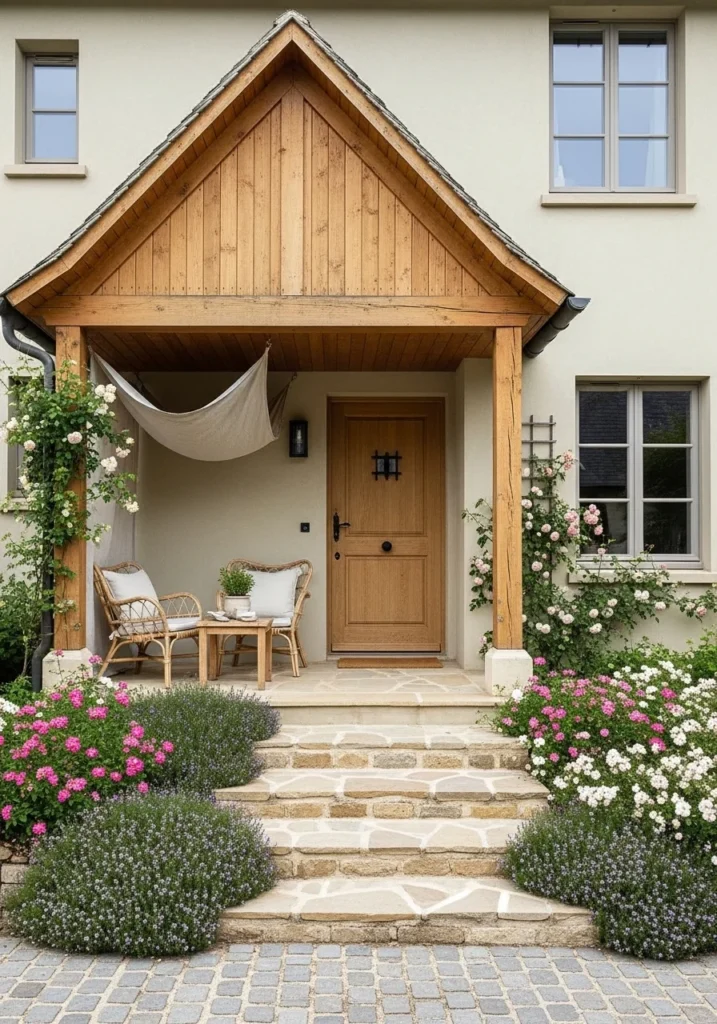 Combine warm timber-clad gable with pale limewashed walls for textural contrast. A narrow covered porch with natural linen canopy provides sheltered entry while adding soft, organic element.