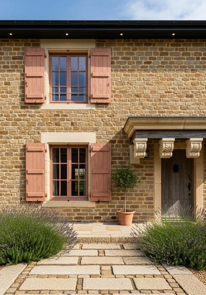 Pair warm natural stone with soft terracotta-painted shutters for classic Provençal color harmony. The modest stone porch with carved corbels adds architectural interest while maintaining human scale.
