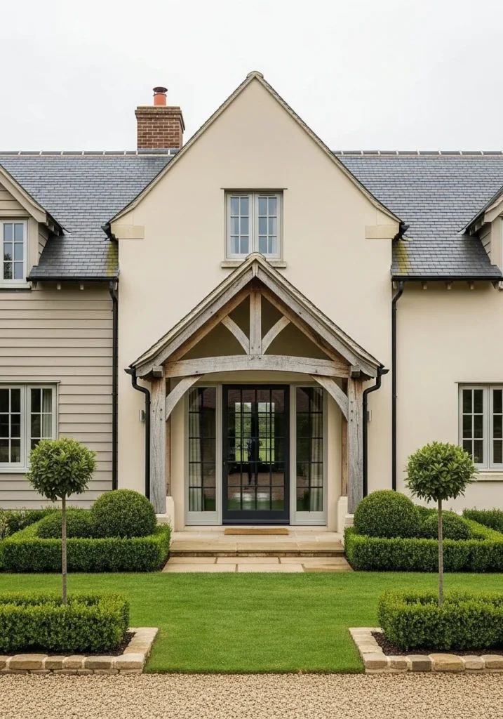Create visual interest through two-tone render in cream and pale taupe. An oak canopy over the entry provides shelter while adding substantial architectural presence to the facade.