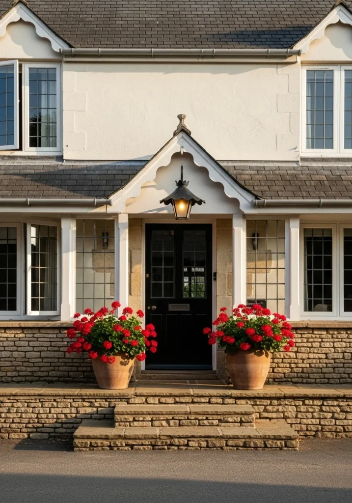 Potted geraniums and scalloped iron lanterns add classic cottage details while the slate roof with petite gable maintains proper scale. This approach works particularly well for smaller homes where every detail contributes to overall charm.