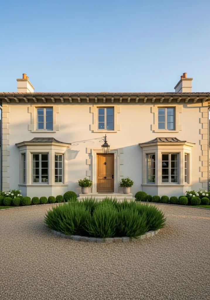 Pebble drives and wrought-iron gates with stone posts create authentic period details while lavender beds and stone benches add living elements. This combination works well for homes seeking understated elegance.