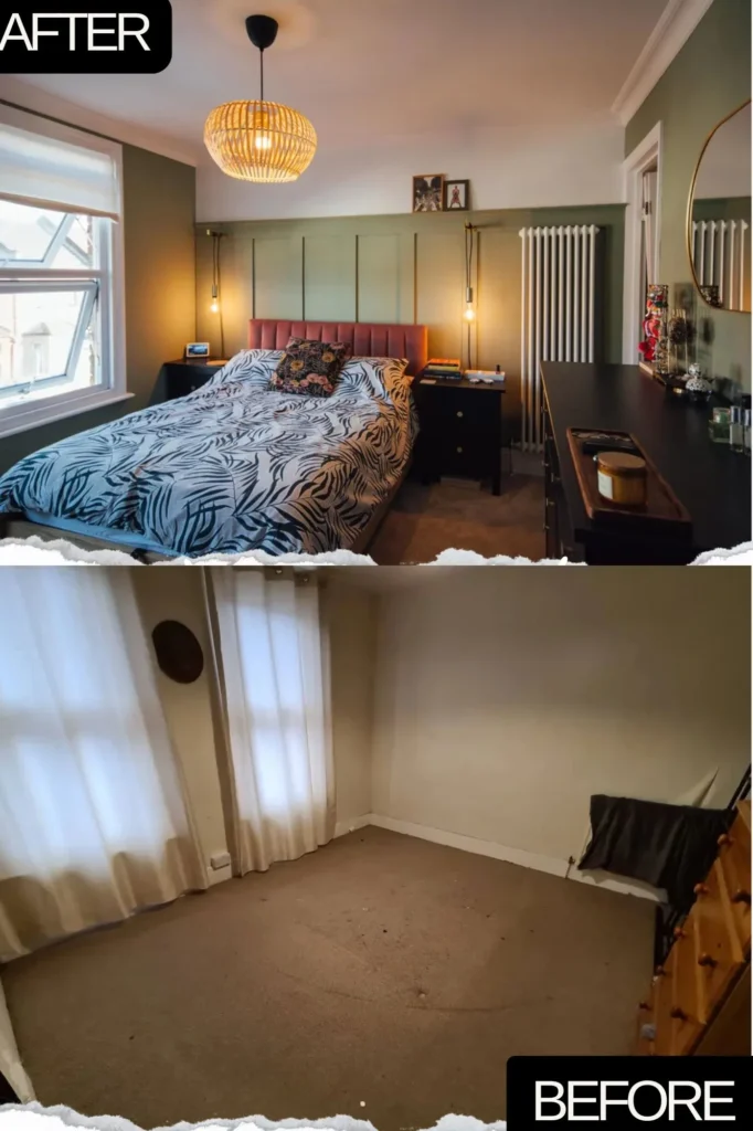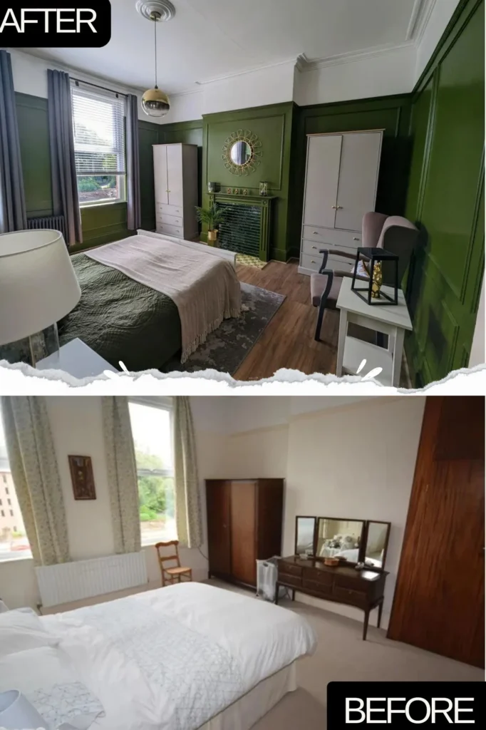 Period features need respect. u/blissingmeee went from tired beige walls with dark wood furniture to rich olive green paint with board-and-batten paneling highlighting architectural bones. Keeping the original fireplace honors history, white freestanding wardrobes feel lighter than built-ins, and that sunburst mirror above the mantel adds glamour. The mix of textures – green velvet throw, patterned rug, modern curtains – keeps things layered and collected.