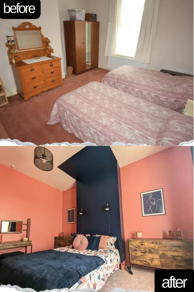 Fearless color blocking from u/blissingmeee paired coral pink with deep navy blue creating dynamic visual interest. The geometric paint application with sharp angle is architecturally striking, simple line art prints tie into both colors, and black metal platform bed feels modern. Reclaimed wood dressers add warmth against all that color, and layered bedding pulls tones from walls creating cohesion.