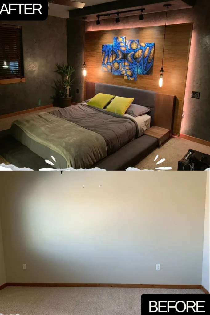 Going from builder-grade blank to industrial chic takes bold choices. u/funktoes311 added horizontal wood plank wall with strategic LED backlighting creating depth, concrete-look accent walls add industrial edge, and that vibrant blue and gold abstract art becomes absolute showstopper. The low platform bed feels modern and grounded, Edison bulb pendants hanging at different heights add interest, and layered bedding in neutrals with pops of chartreuse yellow ties into artwork.