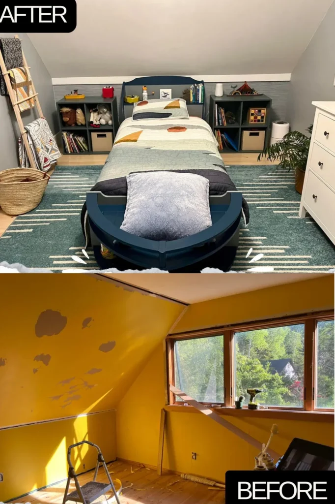 Attic bedrooms are tricky but u/Tamsyn_TC made it work going from bright overwhelming yellow walls to soft blue-gray that makes the sloped ceiling feel intentional. That boat-shaped bed turns the theme into something fun instead of generic, cube storage units provide tons of practical space, and the striped rug reinforces nautical vibes without being too literal. The natural wood ladder adds rustic charm, and the blue, gray, and white palette creates calming cohesive looks.