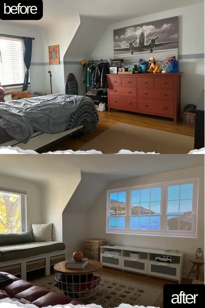 Smart space use matters. u/NYSmile kept gray tone but simplified walls creating calmer backdrop, and that faux window with ocean view is clever trick making cramped space feel open. Built-in window seat with storage is genius, low white media console keeps entertainment gear organized, and round basket coffee table adds casual style. The neutral palette lets personalization happen without fighting the room’s bones.