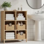 Grab smoked walnut floors and drop a geometric hand-tufted rug with blocks of almond, olive and blush under a tailored linen bed. Matte plaster walls set a modern mood, while fluted glass pendants highlight those crispy rug lines. Built-in walnut cabinetry and round marble table with brass base cap the look. Always style dried grass with modern shapes for added drama. Rule: Don’t hide the rug—let it peek out around the bed. If your rug is invisible, your floor game is weak.