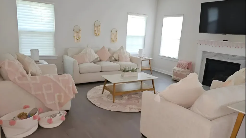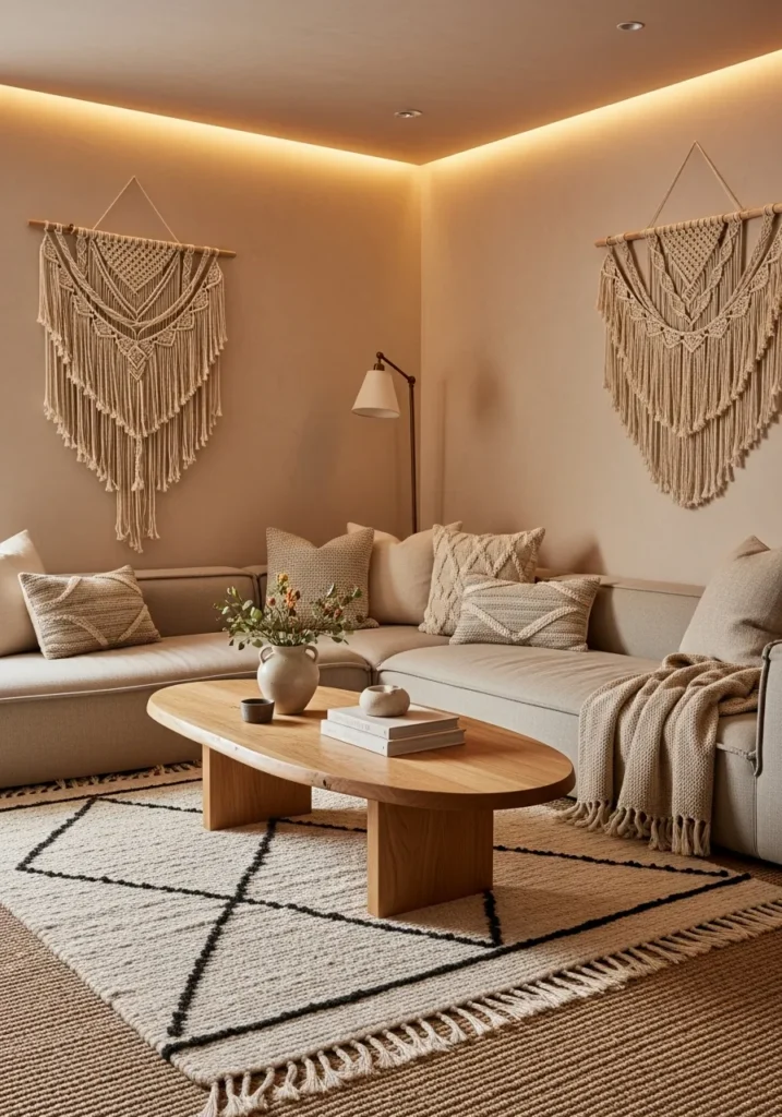 u/Prestigious_Sky8257 created this incredibly soft, feminine boho space with cream sofas and blush pink accents throughout. Those small macramé wall hangings add boho texture without overwhelming, while the mix of pillows in cream, blush, and subtle patterns creates layers.