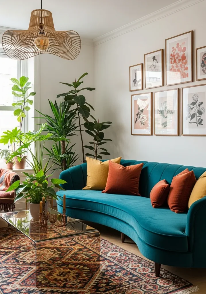 A curved deep-teal velvet sofa becomes the anchor for this jewel-toned space, dressed with rust and mustard wool cushions for warmth. A low smoked-glass coffee table sits on a patterned kilim, while tall potted philodendron and fiddle-leaf fig bring life and air-purifying benefits.