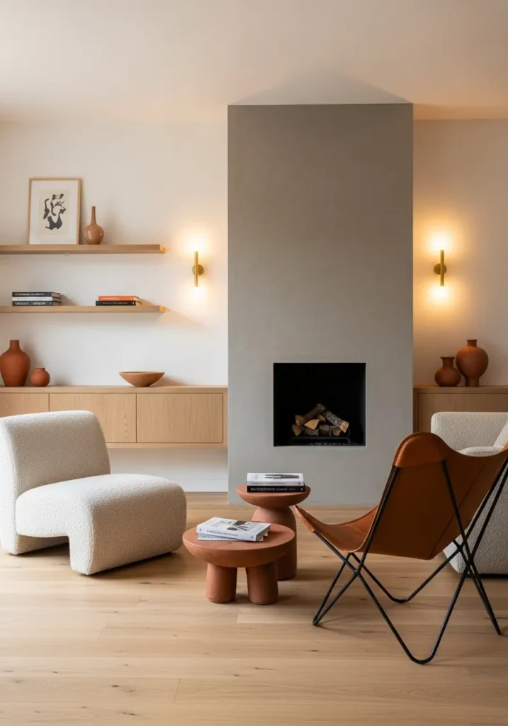 A reeded oak media wall with floating shelves provides architectural interest, paired with a matte-clay plaster fireplace surround that adds warmth and texture. A boucle lounge chair and cognac leather sling chair offer varied seating options.