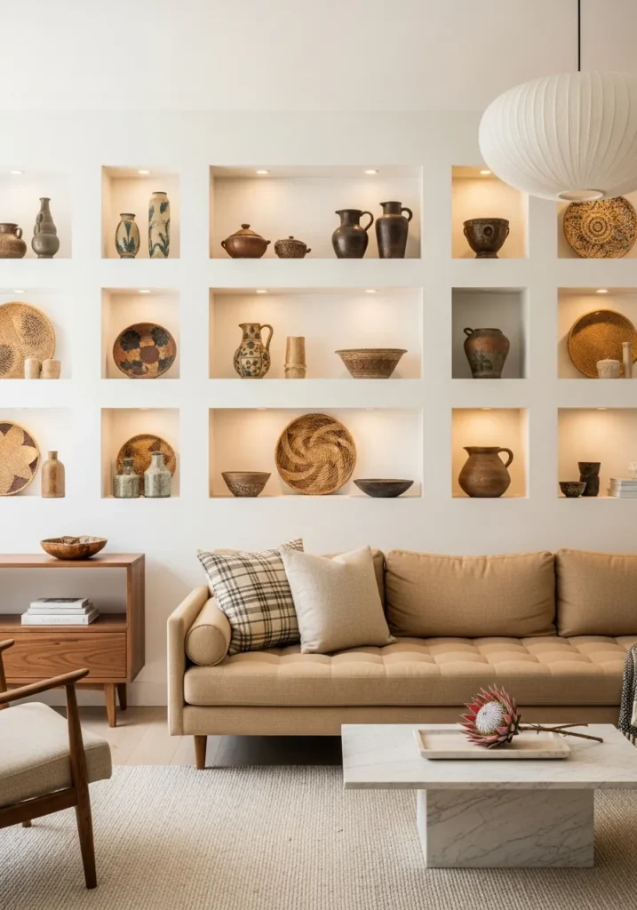 A clean-lined low sofa in warm oatmeal anchors the space, while a wall of recessed niches displays curated global ceramics and woven trays—collected treasures that tell a story. A narrow walnut console and low-profile marble coffee table keep the furniture minimal.