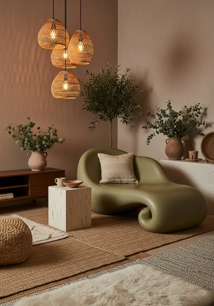 A botanical corner with potted olive and eucalyptus brings the outside in, and a pendant cluster in woven rattan with warm bulbs provides ambient lighting. The three-quarter view shows that warm earthy palette and sculptural planting.