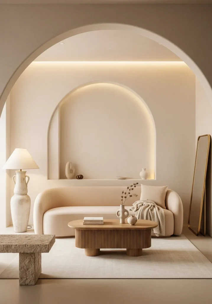 Gentle arched drywall openings create architectural interest, while a rounded plaster sofa in warm cream follows the curved theme. A fluted oak coffee table and low stone bench provide varied surfaces and seating.