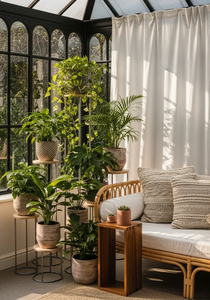 A glassed conservatory corner features a rattan daybed with neutral boucle cushions—perfect for afternoon naps or reading. Tiered plant stands hold trailing pothos and large-leaf palms, while cylindrical clay planters and a narrow teak side table complete the setup.