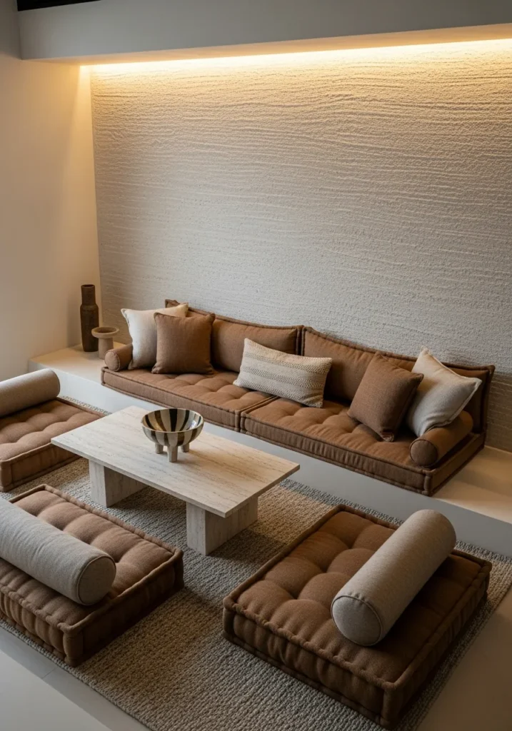 This is low-to-the-ground living—relaxed, communal, perfect for people who prefer floor seating to traditional sofas.