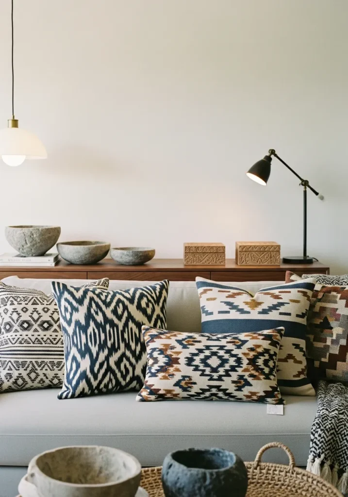 A neutral base sofa gets layered with throw pillows in three distinct artisanal patterns (geometric, ikat, abstract) that somehow work together without fighting. A low walnut sideboard gets styled with hand-polished stone bowls and carved wooden boxes.