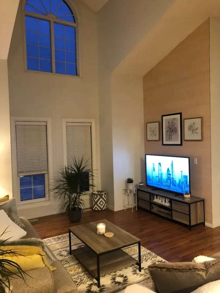 u/schretties shows how boho can work in a modern space with high vaulted ceilings and an arched window. The neutral color palette (gray sofa, wood coffee table, cream accents) keeps things calm, while the patterned rug and yellow throw pillow add visual interest.
