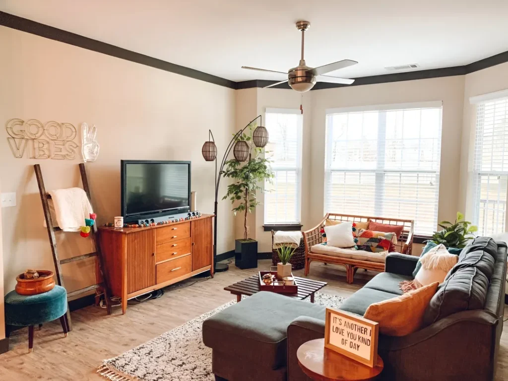 u/hunnieluv43 nailed the mid-century boho blend with that warm wood media console, gray sectional, and pops of teal and orange throughout. The rattan daybed with colorful pillows adds textural seating and that signature boho vibe.