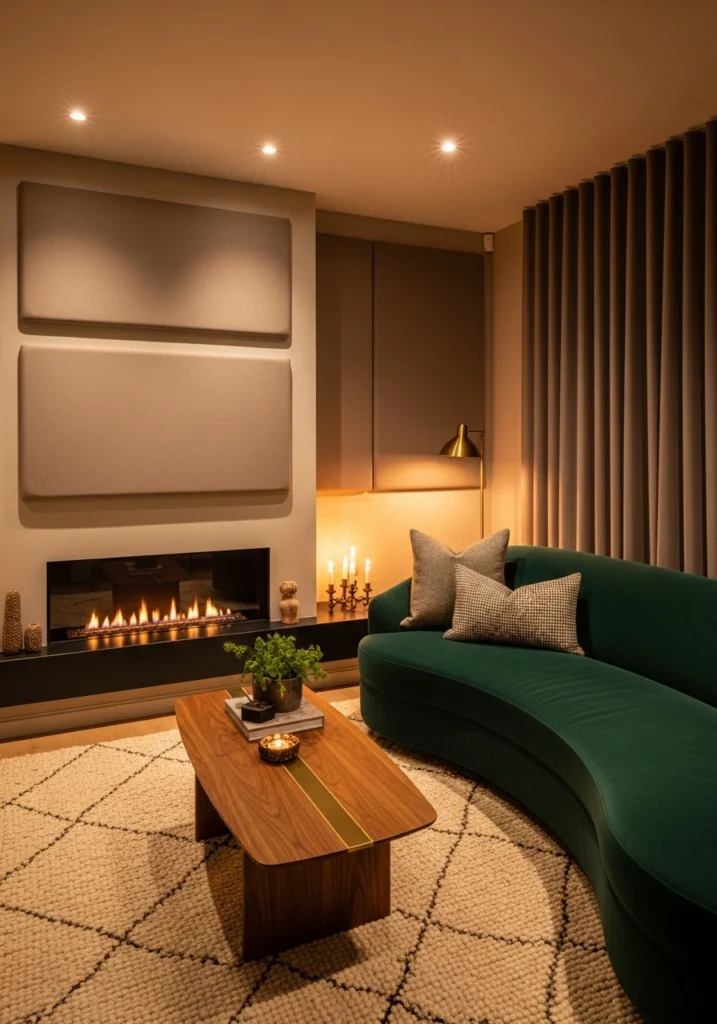 Soft acoustic velvet panels in a tonal grid behind a low-profile sofa do something smart—they improve sound quality while looking intentional. A slender media console with a hidden speaker system and discreet projector housing keeps tech integrated without being the main event. Walnut coffee tables with recessed trays stay functional, and smart dimmable lighting with warm presets means you can change the mood without getting up.