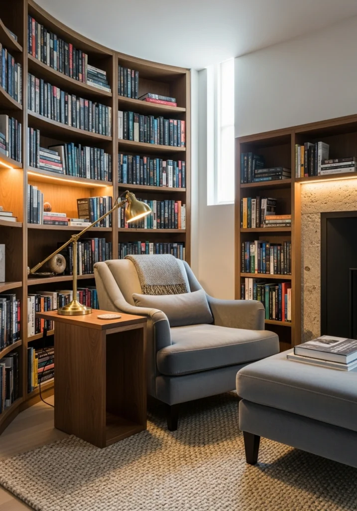 Built-in curved bookcases wrapping around a snug armchair create that library cocoon feeling where you could lose an entire weekend. Slate velvet upholstery on the chair feels luxe but still practical, and a slim walnut side table with an adjustable brass reading lamp means you can actually see what you’re reading without overhead glare.