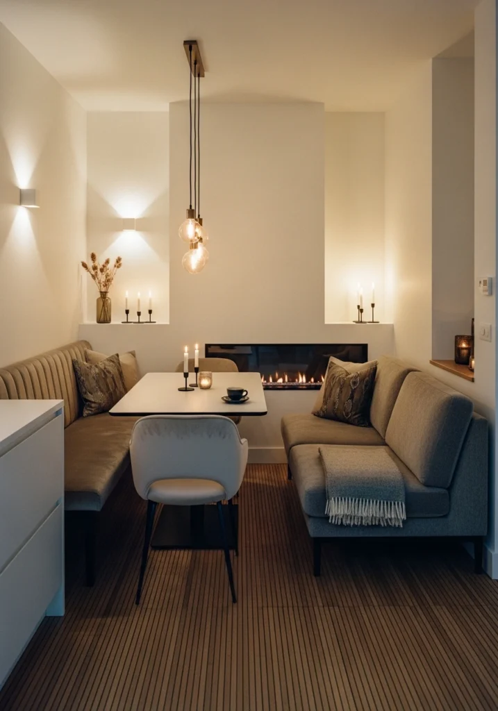 Small footprints need furniture that does double duty. A narrow banquette upholstered in velvet facing a slim dining table that also works as a console for coffee creates flexibility throughout the day. An adjacent compact two-seater sofa oriented toward a slim linear fireplace gives you the cozy fire element without eating up the whole room.