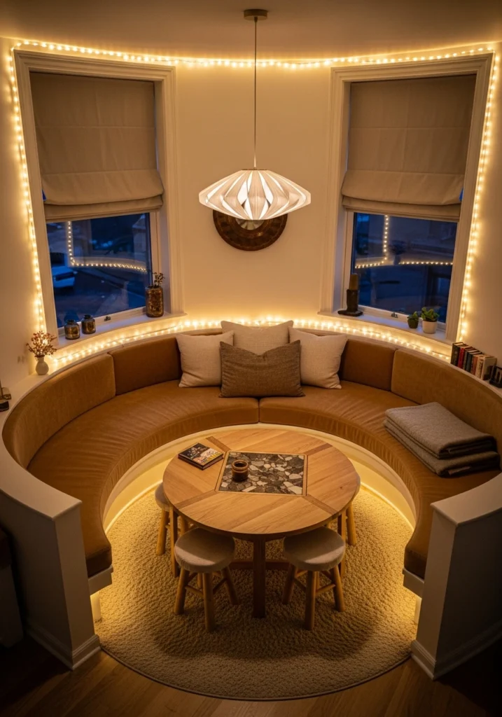 Soft perimeter string lighting and a single sculptural pendant create ambient glow without harsh overhead fixtures. Tall narrow windows with roman shades control light, and layered cushions with folded wool throws make the space inviting. This conversation pit approach works when you want gatherings to feel close and connected.