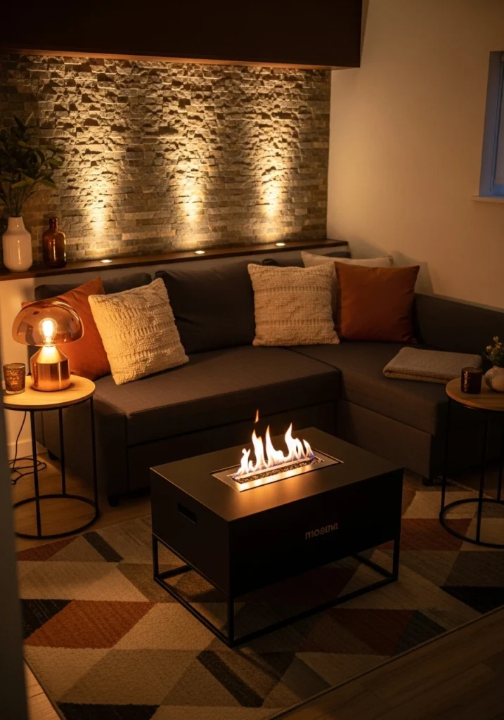Compact lounges need a focal point, and a portable low fire table in matte black delivers. Deep charcoal sofas with plush chaises create serious comfort, and warm copper-accent side tables and lamps bring metallic warmth without being showy. A burnished stone accent wall behind the sofa adds texture and grounds the space.