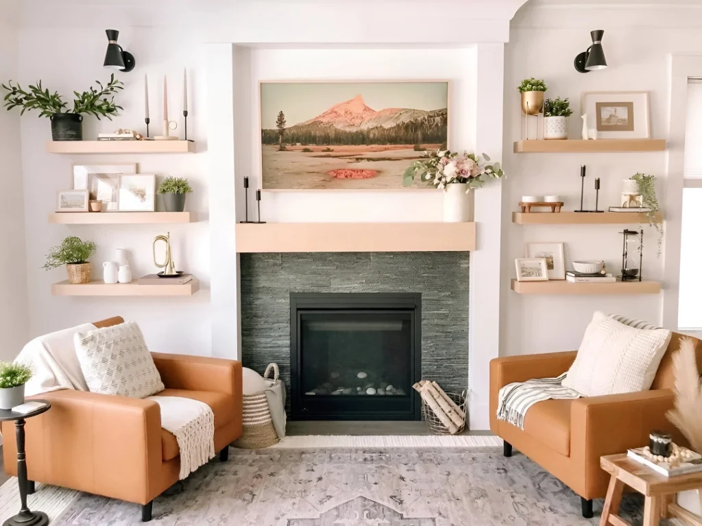 Symmetry creates calm, and this fireplace setup nails it. Two cognac leather chairs flanking a modern gas fireplace with stacked stone surround create perfect balance. Floating light wood shelves on either side hold plants, candles, and small decor without looking cluttered.