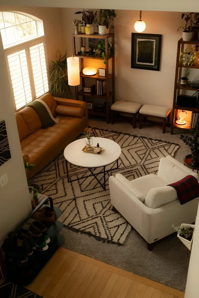 This overhead shot shows how mixing seating types can make a small space work harder. The tan leather loveseat and white chair create conversation zones without matching-set energy, and that round white coffee table with black metal base keeps the center open. The geometric rug adds pattern without overwhelming the neutral palette.