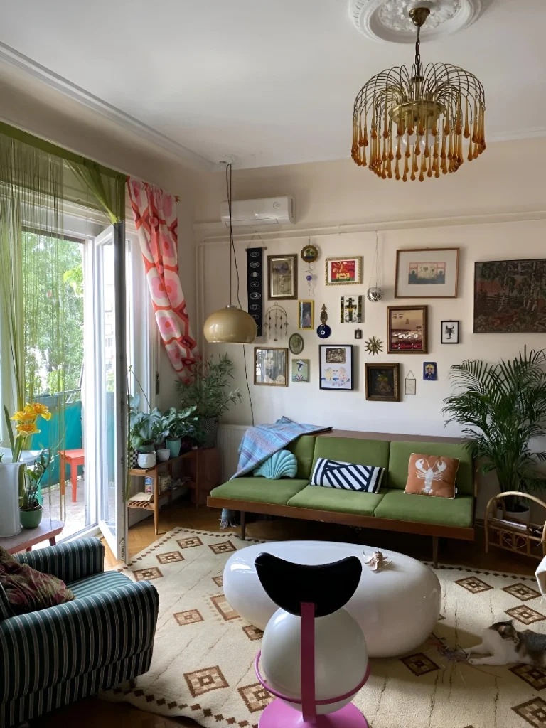 That vintage chandelier immediately sets the tone—this isn’t a cookie-cutter space. The gallery wall mixes frame sizes, art styles, and even includes some decorative plates, creating this collected-over-time feeling that you can’t fake. The olive green mid-century sofa with wooden arms brings color and character, and those mixed-pattern pillows don’t match but somehow work together.