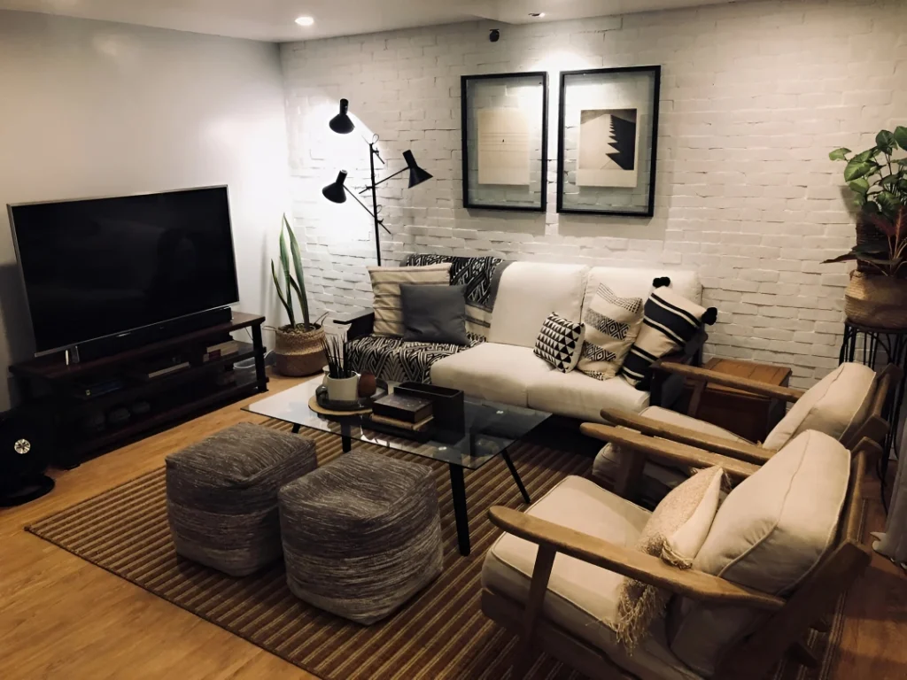 Round smoked-glass coffee tables don’t block sightlines, and wool braided poufs scattered around provide extra seating without taking up permanent real estate. That sculptural black floor lamp and geometric patterned pillows add visual interest, while the layered neutral rug ties everything together. The art is simple and doesn’t compete with the texture of the brick wall, and those plants in woven baskets bring life without fuss.