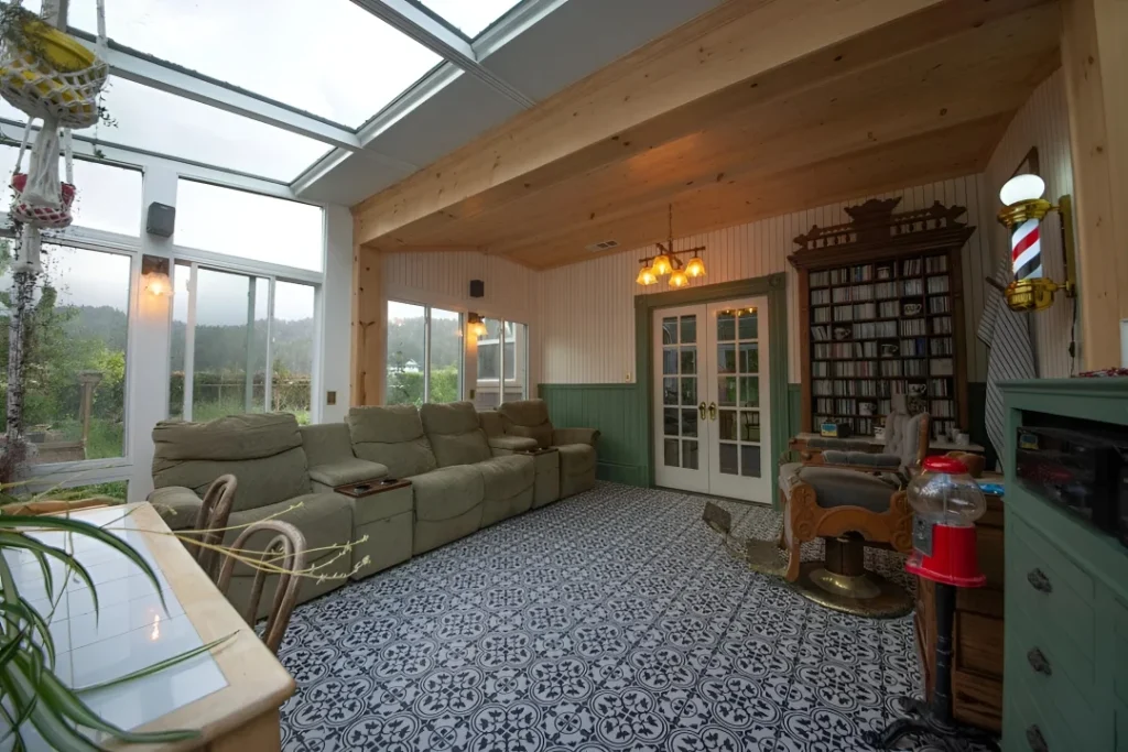 This is the sunroom that refused to have just one identity and it is completely correct for refusing. A full glass roof lets the sky in at every angle, pine tongue-and-groove ceiling panels add warmth where the glass doesn’t reach, encaustic tile covers the floor in a bold geometric pattern, a long reclining sofa faces the view, and in the corner — because why not — a full antique bookcase, a vintage barber’s chair, and a brass wall sconce create a reading-lounge-meets-curio-cabinet situation that is entirely committed to its own logic. It shouldn’t work and it completely does. Rule: a glass-roofed sunroom can hold a lot of personality because the sky above acts as a constant neutral backdrop — use that freedom and put something genuinely interesting in the room rather than defaulting to the obvious.