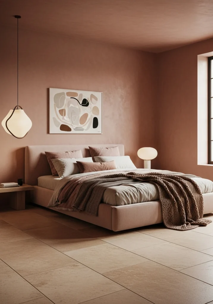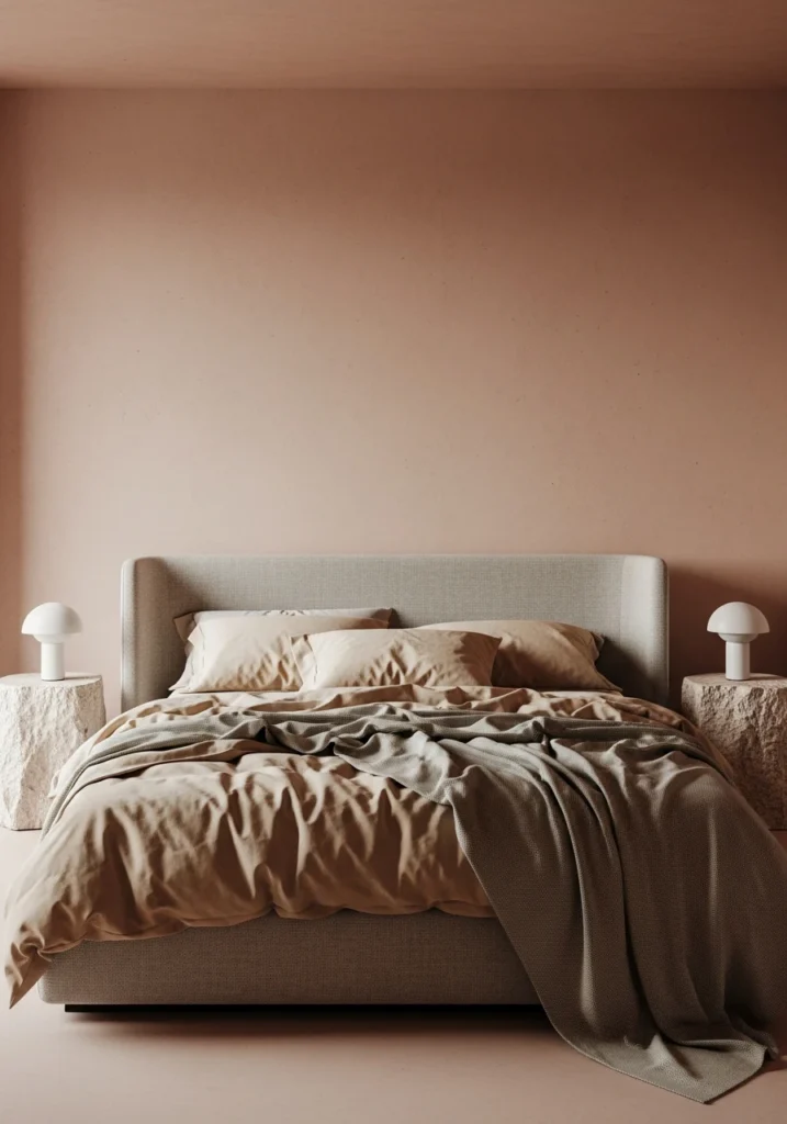 Clay-toned blush walls with subtle texture create this warm, enveloping quality that makes the room feel like a retreat. Layered with warm beige linens and a sculptural upholstered bed, the space builds depth through tonal variation rather than contrast. Natural stone bedside tables ground everything with organic weight.