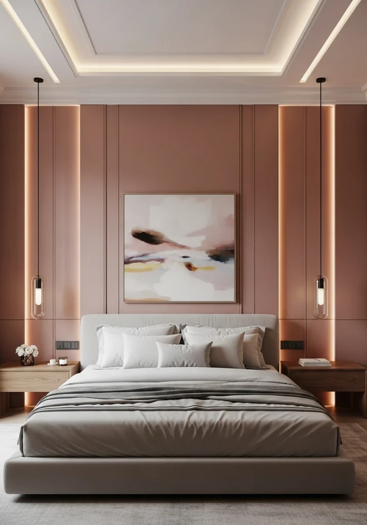 Clean vertical wall panels in muted rose create architectural interest that goes beyond just painted walls. Paired with tailored neutral bedding and low-profile furniture, the pink becomes a design element rather than a decorative choice. Warm wood accents add natural contrast without breaking the color story.