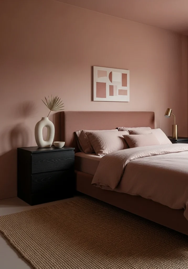 Committing to monochrome pink takes confidence, and this bedroom delivers. Layered entirely in earthy pink variations from matte walls to soft textiles and upholstered furnishings, the space creates depth through tone and texture alone. Minimal decor keeps the focus on the tonal layering.