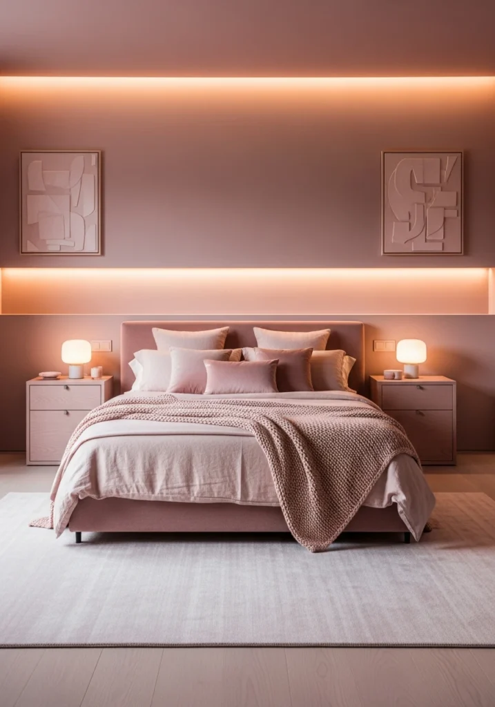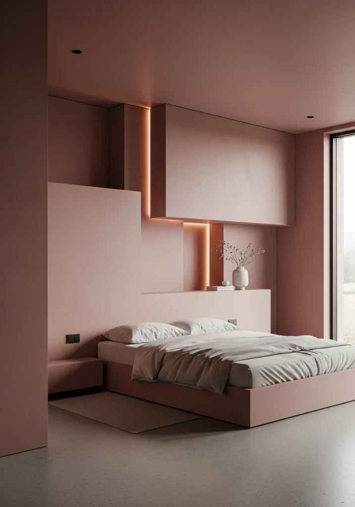 Dusty rose wall planes with clean geometry make the color feel architectural rather than decorative. The integrated headboard design shows how built-in elements can be both functional and beautiful. Soft matte finishes keep everything feeling sophisticated and modern.