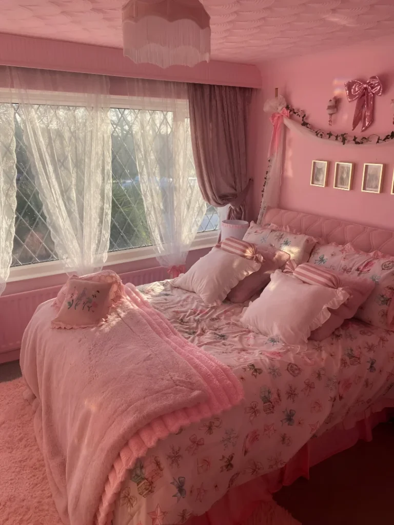 Going full commitment with pink everything takes confidence. This bedroom wraps walls, ceiling, curtains, and bedding in coordinating pink tones for complete color immersion. The fringe chandelier and layered textiles add texture that prevents the monochrome from feeling flat.