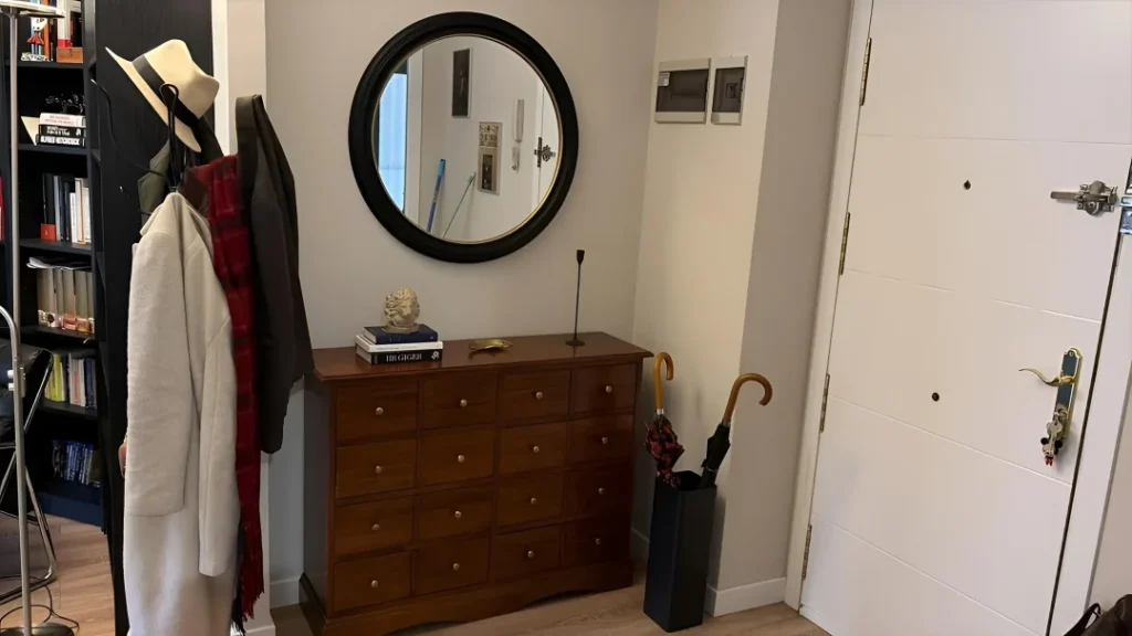 The unspoken rule that entryway furniture must be purchased from the entryway furniture section of anywhere is a rule this setup broke completely and correctly. A wide apothecary-style chest of drawers in warm walnut with brass knob hardware is functioning as the primary surface piece, topped with a round black-framed mirror, a small sculptural object, a stack of books, and a thin black candle holder—and it’s providing sixteen drawers of storage that a conventional console table with one shelf could never match. A freestanding coat rack with a sculptural arc holds everything from a white wool coat to a plaid scarf to a wide-brimmed hat, and a black metal umbrella stand deals with the rain situation without drama. Two small framed photographs hang on the wall at different heights, informal and personal. The whole setup has the quality of something assembled thoughtfully over time rather than purchased in one trip—which is the quality that no amount of styling can manufacture if the furniture itself doesn’t have it. The lesson: the best entryway furniture is often not designed as entryway furniture.