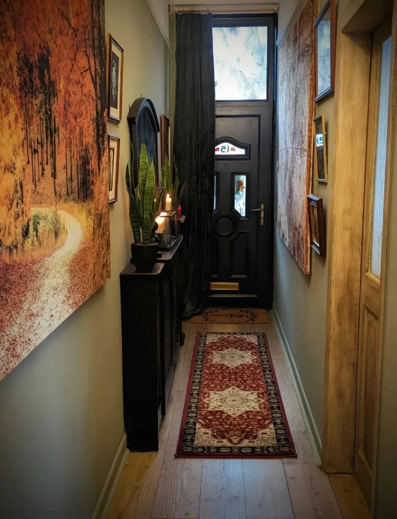 This is a hallway that looked at its own one-metre width and said “fine, we’re leaning in.” Sage-green walls provide the backdrop, neither dramatically dark nor forgettably pale—landing in exactly the range that makes a narrow space feel considered without feeling heavy. Both walls are hung gallery-dense with oversized artwork: a large autumnal forest tapestry on the left takes up most of the wall surface and brings a warm, amber depth that the sage green sets off beautifully. A black radiator cover serves as a narrow console, topped with a snake plant, candles, and a small dark ceramic bowl—the fact that it’s a radiator cover doing console duty is completely invisible because it’s been styled with enough intention that nobody is looking for the radiator underneath. A red Persian runner leads the eye directly toward the black front door at the end, and the stained glass transom above it casts colored light into the space that changes throughout the day. The oval mirror above the radiator console fakes depth without looking like it’s trying to, and the result of all of it together is a hallway that feels inhabited, considered, and genuinely characterful—which is everything a narrow Victorian corridor should be and almost never is.