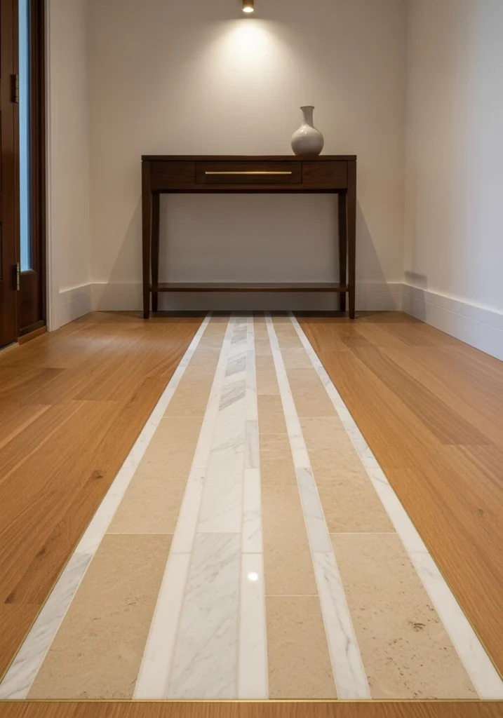 This isn’t technically a rug, but it functions like one—a long runner made from narrow marble and honed stone inlay tiles forming a subtle linear pattern (white Carrara veins on warm-beige base) inset flush into polished oak flooring.