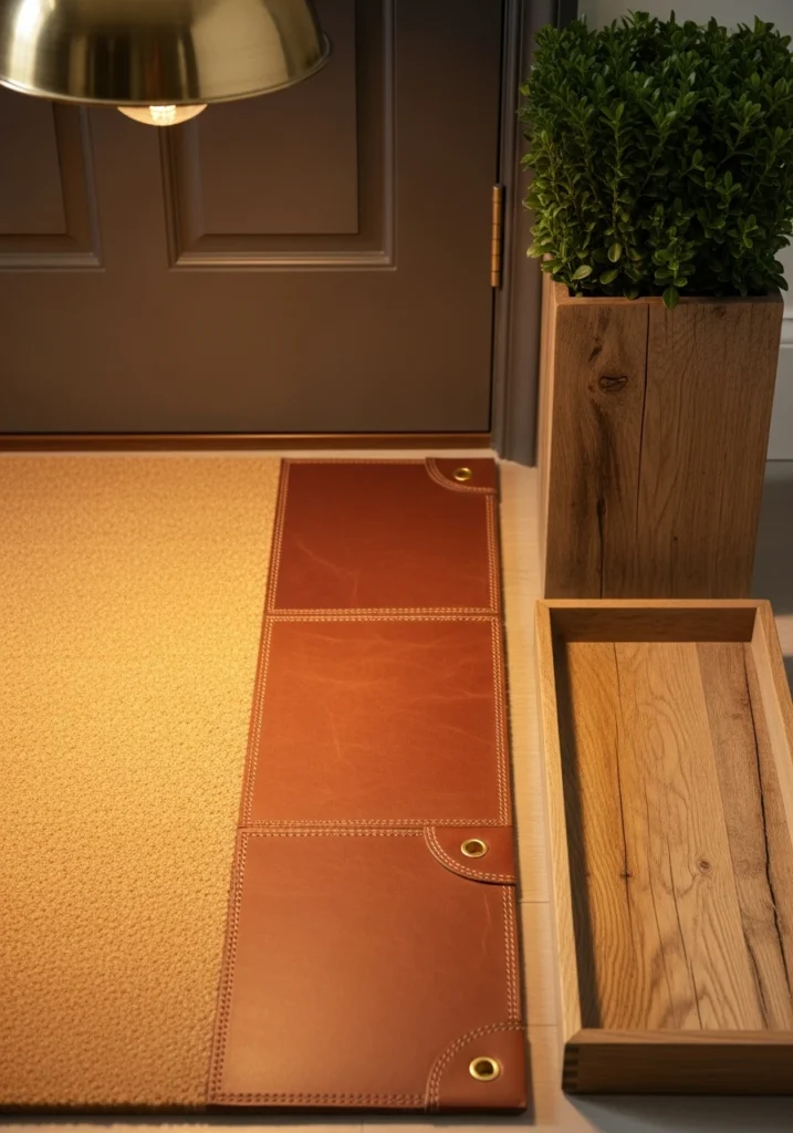 A rectangular wool runner with inset panels of saddle-stitch leather in soft chestnut and small brass eyelet detailing at corners brings unexpected luxury and texture. A narrow reclaimed-oak boot tray beside it provides practical storage.