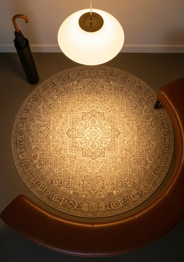 A soft halo pendant above produces warm pool light that makes those bronze threads glow. The top-down 30° angle captures that circular composition and metallic shimmer—this is a rug that changes with the light throughout the day.