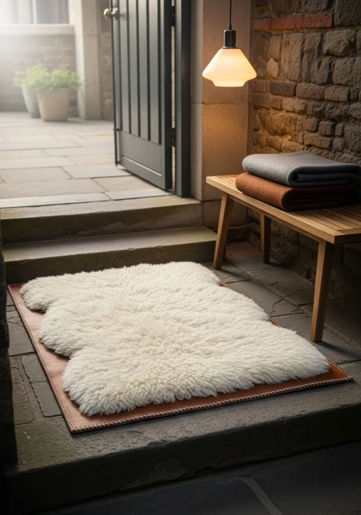 A luxe sheared lambswool rectangle with reinforced leather backing and stitched edge brings softness and durability together. Placed on a narrow stone stoop with slim teak bench and folded wool throws stacked beside creates this welcoming entry moment.