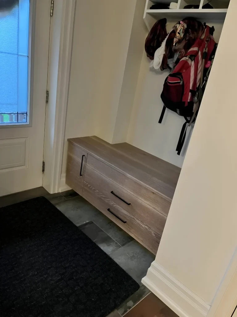 u/engineereenigne shows how a dark floor can work in an entry when you keep everything else light and simple. That dark slate or tile flooring is incredibly practical—hides dirt beautifully—while the built-in wood bench with storage keeps things organized.