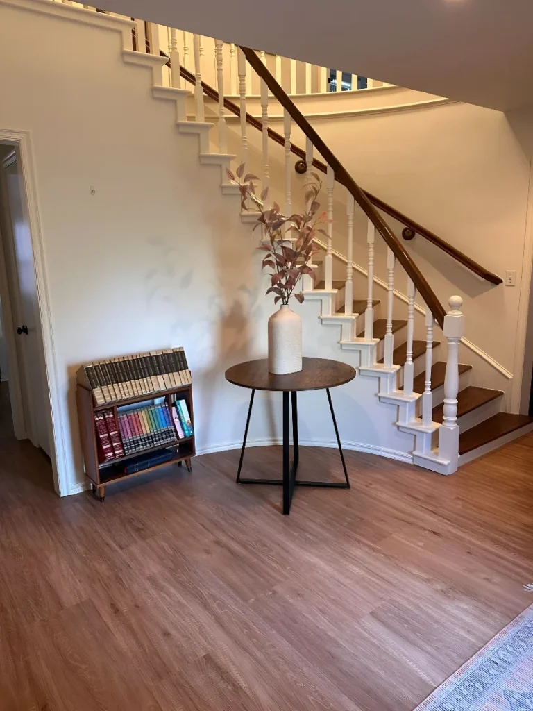 The bones here are genuinely excellent — a sweeping curved staircase with white-painted turned balusters, a rich walnut handrail, and generous treads that carry the curve all the way down to a wide landing — and the entryway around it is still figuring out what it wants to be. A round side table with a single vase of dried stems makes a reasonable attempt at filling the space the staircase creates, and the small bookshelf has clearly been positioned rather than placed, but both feel provisional against the architectural confidence of the stair itself. The pale wood-look flooring works, the white walls give the balustrade its contrast, and all the structural decisions are sound. What this entryway needs now is a piece of lighting scaled to the height, a wall treatment that acknowledges the curve beside it, and the removal of the bookcase in favour of something that earns the square footage more convincingly.