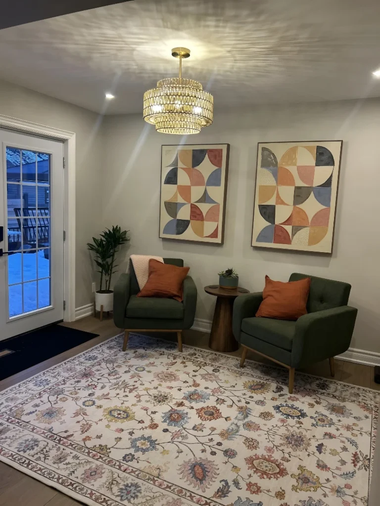 The radical move here was treating the entryway as a room where people actually sit, rather than a space they pass through as quickly as possible, and then furnishing it with enough conviction that the idea holds. Two deep forest green barrel chairs with walnut legs face each other across a small cylindrical side table, both loaded with terracotta velvet cushions that pull the warm tones from the geometric art diptych hanging above. Those prints—muted arcs and quadrants in rust, slate, gold, and cream—are sized generously enough to anchor the full wall without crowding it. A gold multi-tier pendant chandelier overhead casts light in all directions, its reflections playing across the ceiling in a way that makes the room feel lit from everywhere at once. A floral Persian rug in complementary tones grounds the seating zone and makes arriving home feel like walking into somewhere genuinely worth stopping in.