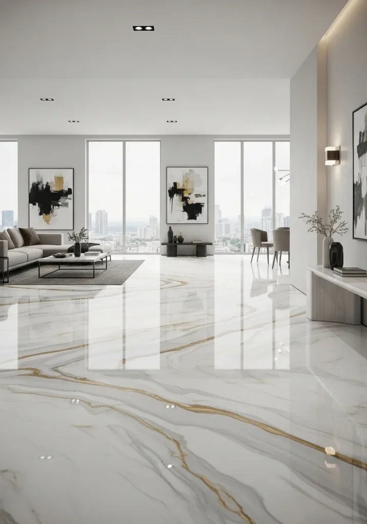 Floor-to-ceiling windows bounce natural light across that polished surface all day. Minimalist furniture lets the floor be the statement piece it deserves to be. Clean architectural lines throughout the space complement rather than compete with the marble movement below. The reflective quality makes everything feel more expansive and gallery-level elegant.