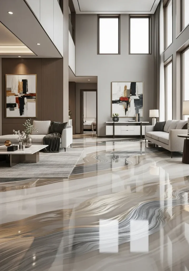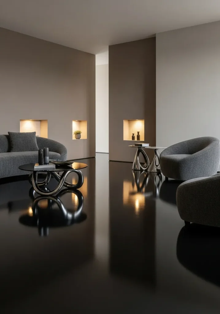 Matte wall finishes provide textural contrast to the glossy floor. Sculptural furniture pops against that cool grey base. Controlled lighting emphasizes the architectural quality of both the space and the floor. The highly modern aesthetic stays clean and powerful without any industrial harshness.