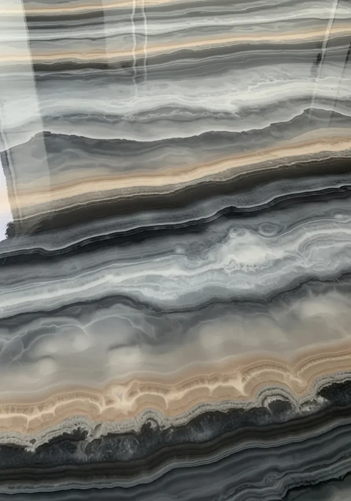 This floor looks like someone poured liquid marble and let it settle into these gorgeous flowing patterns. High-gloss white and soft grey tones move seamlessly into subtle champagne veining, creating depth that static tile could never achieve. The effect works beautifully in modern open-plan interiors where the floor can run uninterrupted.