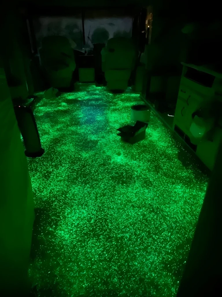 Taking epoxy into unexpected territory, this luminescent green floor glows under UV or low light conditions. The metallic emerald base catches light during the day, then reveals its full glowing potential at night. The effect feels futuristic and playful without being childish.
